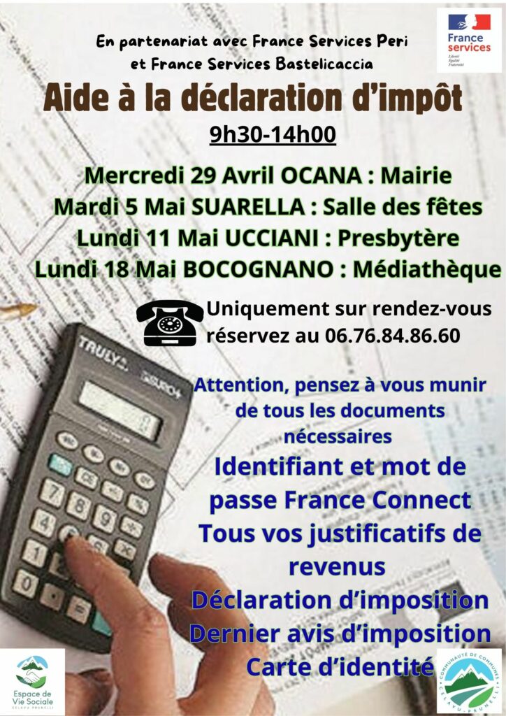 La Communauté de Communes du Celavu Prunelli, en partenariat avec les France Services de Peri et Bastelicaccia, vous propose des permanences d’accompagnement pour vous aider dans vos démarches fiscales.